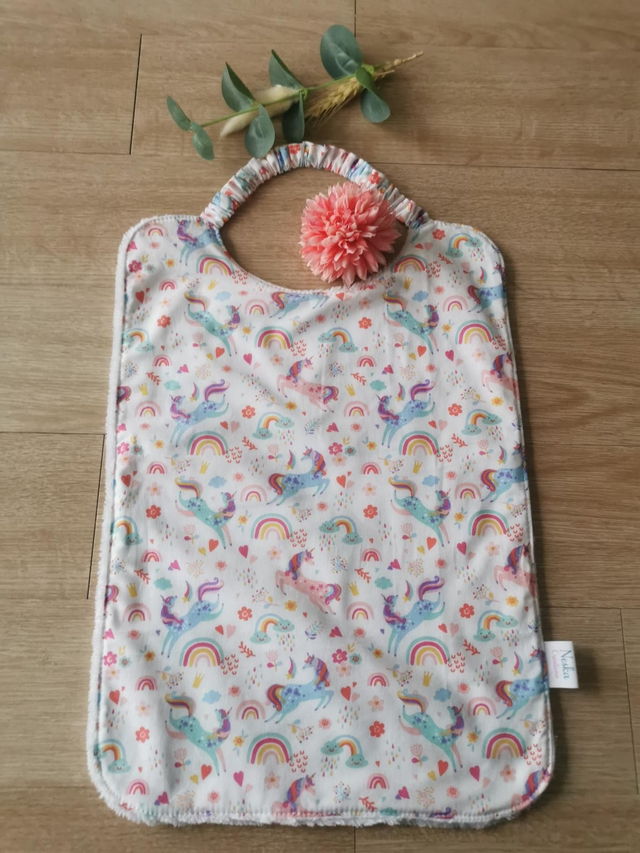 Grand bavoir enfant, à enfilage élastique. Tissu coton à motifs sur le dessus, dos doublé d'un tissu éponge en bambou. Ils sont lavables en machine et personnalisable au prénom de votre enfant